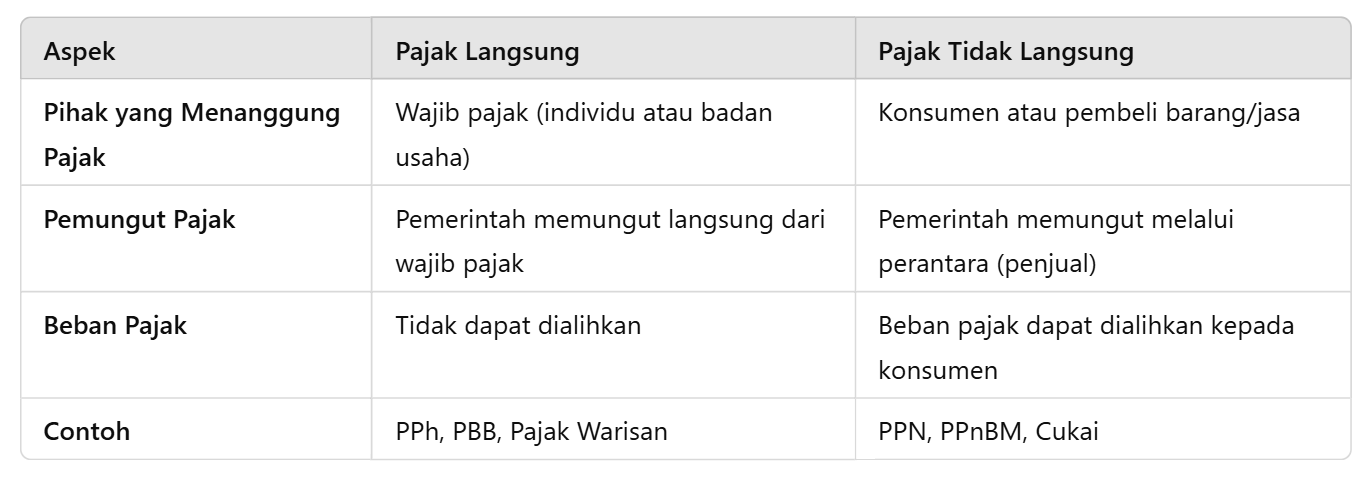 Pajak langsung dan pajak tidak langsung memiliki mekanisme pemungutan dan dampak yang berbeda bagi masyarakat. Pajak langsung membebankan tanggung jawab langsung kepada wajib pajak, sedangkan pajak tidak langsung lebih banyak mempengaruhi konsumen sebagai pihak yang akhirnya menanggung beban pajak tersebut.