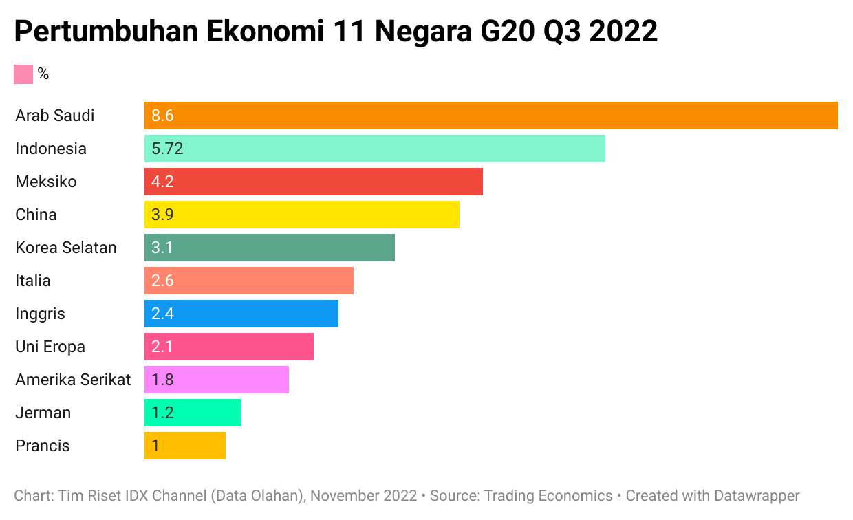 Dari sebelas negara, Arab Saudi mencatatkan pertumbuhan tertinggi mencapai 8,6% YoY. Sedangkan Indonesia berada di peringkat kedua dengan angka 5,72% YoY.