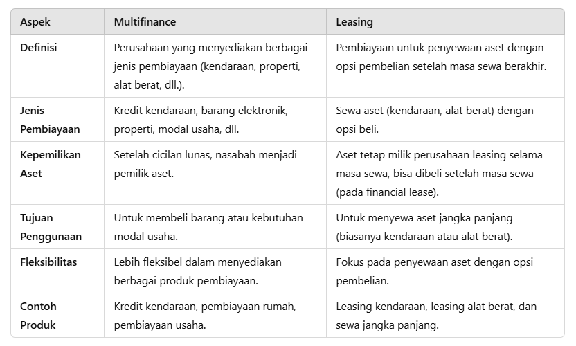 Multifinance adalah lembaga keuangan yang menyediakan berbagai produk pembiayaan kepada nasabah, baik itu pembiayaan kendaraan, alat berat, elektronik, atau properti. Perusahaan multifinance menawarkan produk yang lebih fleksibel, seperti kredit tanpa agunan dan pembiayaan untuk berbagai macam barang. Pembiayaan yang diberikan dapat berupa kredit konsumsi, kredit modal kerja, atau kredit investasi.