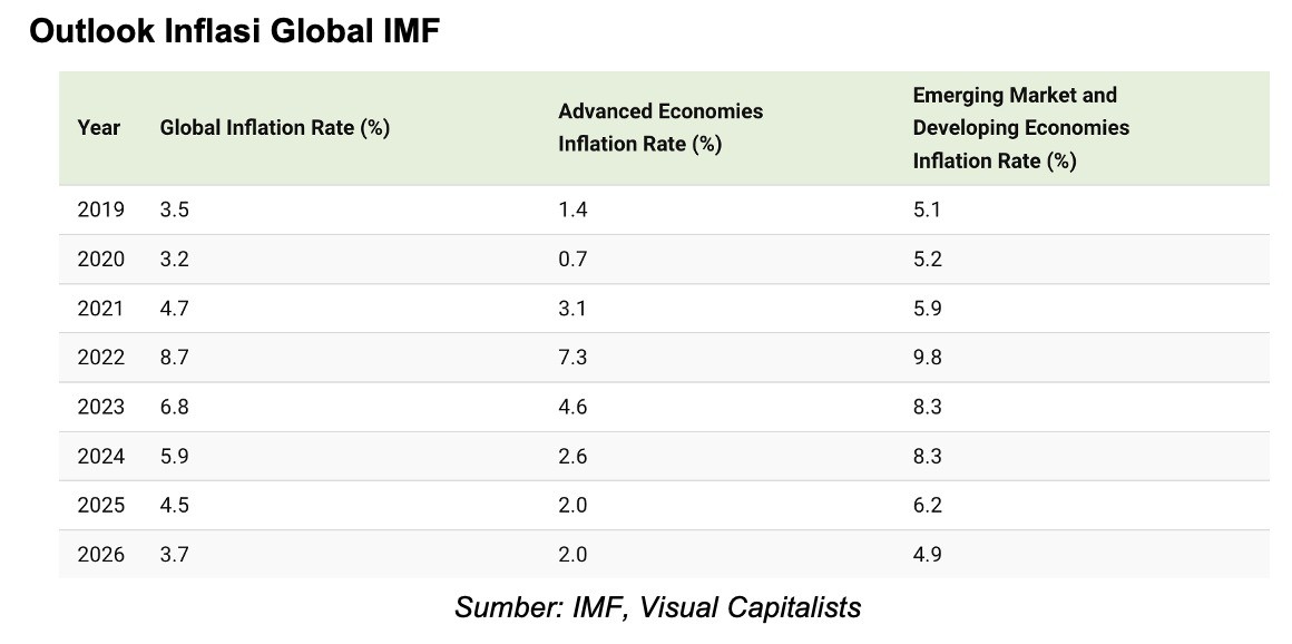 Inflasi global tercatat mencapai puncaknya sebesar 8,7 persen pada 2022. Meski diperkirakan akan turun menjadi 5,9 persen pada 2024, namun masih mencerminkan tren inflasi yang tinggi.