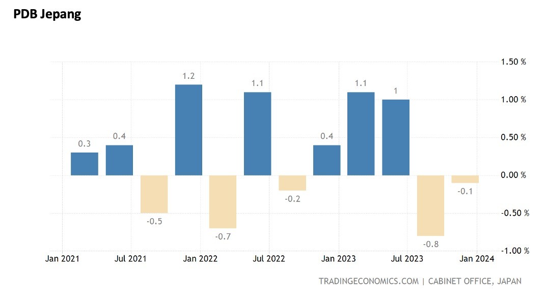 IDXChannel - Jepang secara resmi masuk ke dalam jurang resesi secara teknikal pada kuartal keempat 2023. Produk domestik bruto (PDB) Jepang turun 0,4 persen secara tahunan pada periode Oktober-Desember setelah penurunan 3,3 persen pada kuartal sebelumnya, dan dan turun 0,1 persen secara kuartalan per Kamis (15/2/2024).