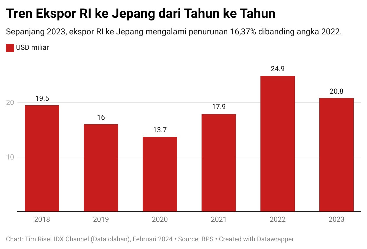 Sementara menurut Badan Pusat Statistik (BPS) menyebut, Jepang menjadi satu di antara negara-negara tujuan utama ekspor Indonesia. Nilai ekspor yang ditorehkan pun cukup besar, yakni rata-rata mencapai USD18,77 miliar per tahun sejak 2018 hingga 2023. Sepanjang 2023, ekspor RI ke Jepang mengalami penurunan 16,37 persen dibanding angka 2022. Angkanya juga lebih besar dari catatan Kemenko Perekonomian.