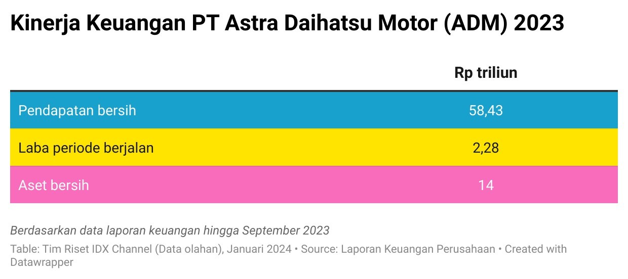 Dalam laporan keuangan ASII, pendapatan dari Astra Daihatsu mencapai Rp58,43 triliun selama 9 bulan di 2023. Angka ini naik 6,03 persen dibandingkan periode sama tahun lalu senilai Rp55,11 triliun. (Lihat tabel di bawah ini.)