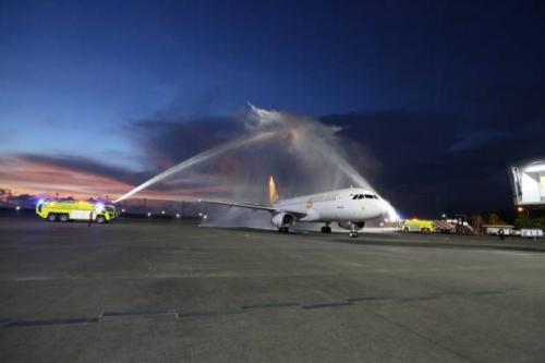 IDXChannel - Super Air Jet akhirnya mendarat perdana di Bandara Ngurah Rai pukul 18.39 Wita. Begitu tiba, maskapai yang menggunakan pesawat Airbus A320 itu disambut dengan water canon salute sebagai tanda inaugural flight.