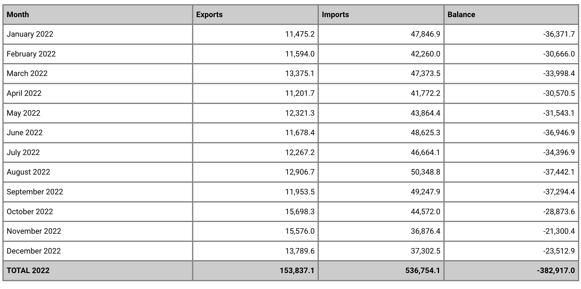 Mengutip data dari Biro Sensus AS, sayangnya kondisi neraca dagang AS dengan China terpantau masih negatif terkontraksi sebesar USD382,92 miliar. (Lihat grafik di bawah ini.)