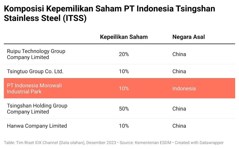 Mengutip sumber di Kementerian Energi dan Sumber Daya Mineral (ESDM) sebanyak 50 persen saham ITSS dipegang oleh Tsingshan Holding Group Company Limited asal China. Sementara pemerintah melalui PT Indonesia Morowali Industrial Park hanya memiliki 10 persen saja.