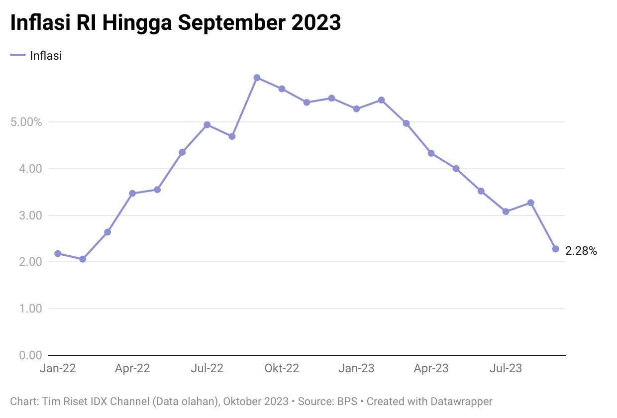 IDXChannel - Badan Pusat Statistik (BPS) melaporkan inflasi September 2023 secara tahunan (year-on-year/yoy) sebesar 2,28 persen. Angka tersebut turun signifikan apabila dibandingkan dengan September 2022.