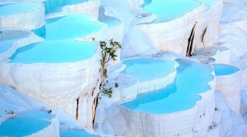 Ada banyak mata air panas yang menghiasi perbukitan Taman Alam Pamukkale, sebuah Situs Warisan Dunia UNESCO yang terletak di barat daya Turki. Di tempat ini, pengunjung akan disajikan panorama air biru kehijauan yang mencolok dengan teras batu kapur putih bersih.