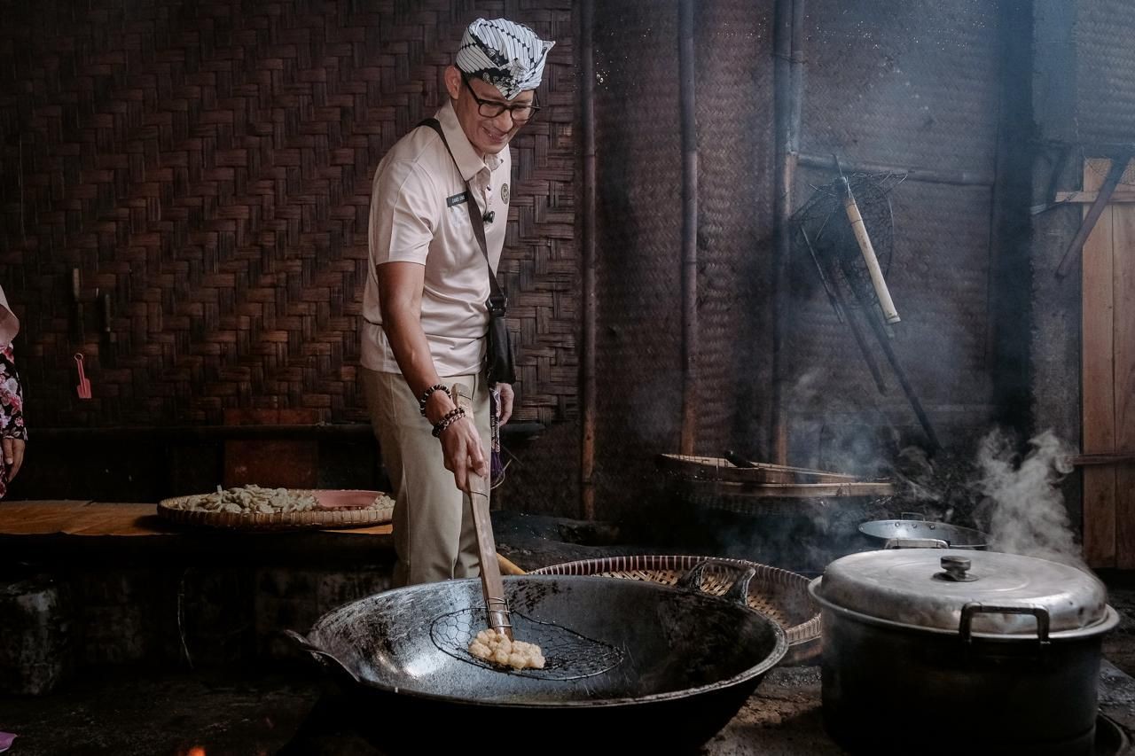IDXChannel - Menteri Pariwisata dan Ekonomi Kreatif (Menparekraf) Sandiaga Salahuddin Uno melihat secara langsung proses pembuatan rengginang, makanan ringan yang terbuat dari beras ketan saat mengunjungi Desa Wisata Wanurejo, Magelang, Jawa Tengah, Kamis (11/7/2024).