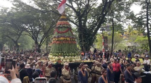 Gunungan tersebut terdiri dari berbagai hasil bumi seperti singkong, kacang panjang, terong dan kol serta berbagai buah-buahan seperti jeruk, jeruk bali, manggis sampai buah pir.
