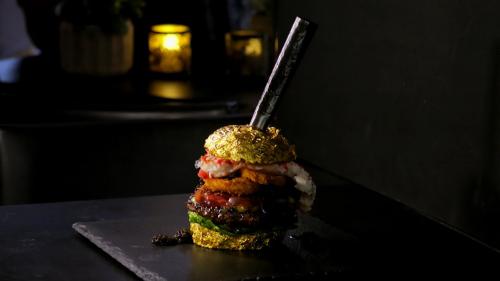 Burger dekaden ini terdiri dari segala macam bahan mahal, dari roti Dom Perignon sampanye yang dibungkus dengan daun emas, hingga daging sapi Wagyu Jepang, kaviar Beluga, Joselito Bellota 100% Iberico Vintage Jamon, Cheddar dengan truffle dari Wyke Farms.