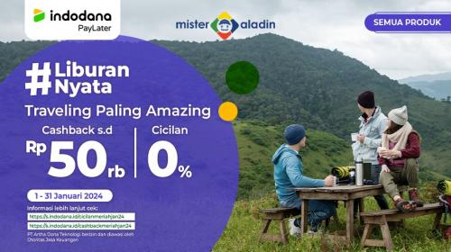 Tahun ini tidak boleh ada lagi rencana yang berujung wacana. Sudah saatnya Anda wujudkan liburan nyata bersama Mister Aladin. Spesial di tahun ini, Mister Aladin dan Indodana punya promo menarik dengan cashback sampai dengan Rp50.000 yang bisa Anda gunakan untuk memesan tiket pesawat, hotel, tiket kereta, dan aktivitas liburan.