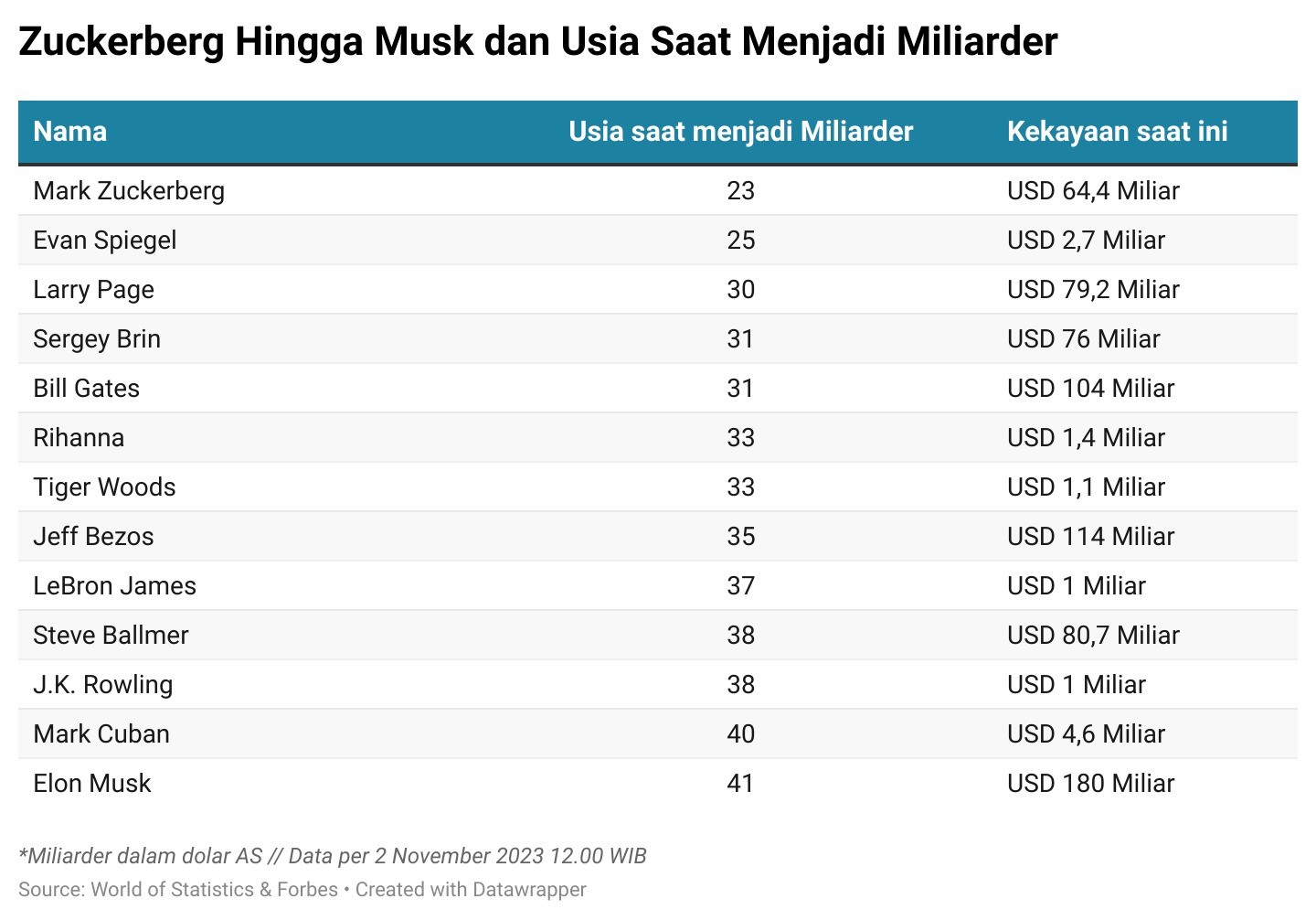 Laporan dari World of Statistics, dikutip pada Kamis (2/11/2023), Mark Zuckerberg menjadi miliarder di usia termuda yang masuk ke dalam daftar tersebut.