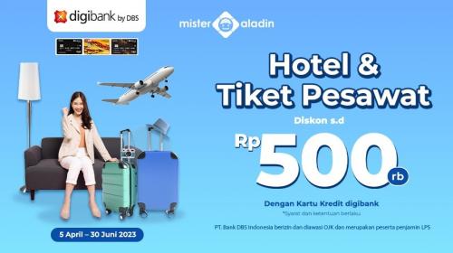 Ada promo hotel dengan diskon hingga Rp200 ribu, dan juga pesawat dengan potongan harga hingga Rp500 ribu. Promo ini berlaku untuk pemesanan setiap Rabu dan Jumat dengan menggunakan kartu kredit digibank.
