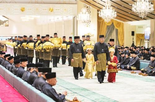 Upacara ini melibatkan perwakilan mempelai pria yang memberikan hadiah dan barang kepada pihak mempelai wanita berlangsung di hadapan Yang Mulia Pangeran 'Abdul Malik di Aula Perjamuan Istana Nurul