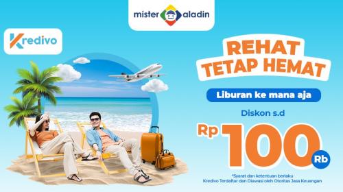 Kali ini, Mister Aladin punya diskon yang nggak kalah menarik dari sebelumnya. Para traveler bisa mendapatkan diskon hingga Rp100.000 jika bertransaksi di Mister Aladin menggunakan opsi pembayaran Kredivo.