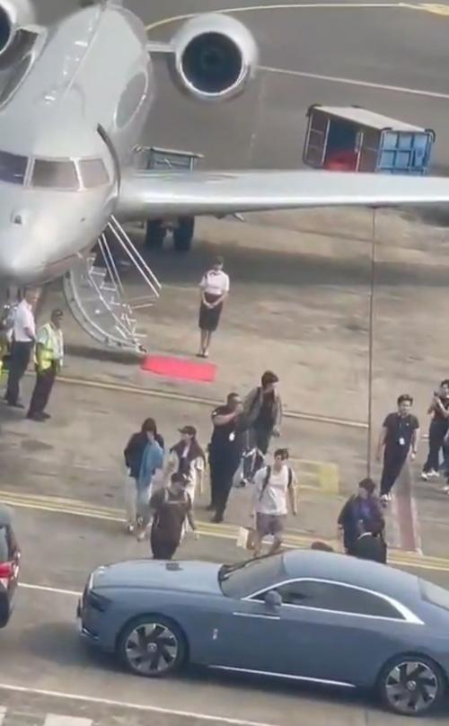 Ia berjalan dari samping private jet yang terparkir di runway bandara sambil didampingi beberapa orang, termasuk manajernya.