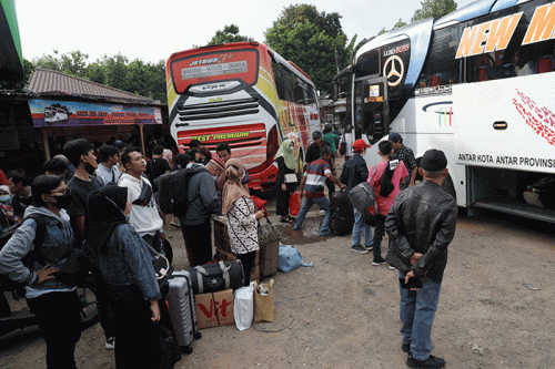 IDXChannel - Sejumlah calon penumpang bersiap naik bus di Terminal Bus Pondok Pinang, Jakarta, Minggu (16/4/2023).