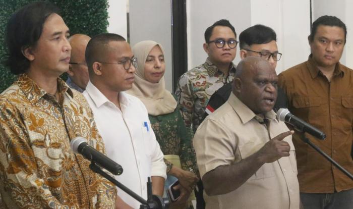 IDXChannel - Menteri Hak Asasi Manusia (HAM) Natalius Pigai (tengah) bersama Ketua Asosiasi Komposer Seluruh Indonesia (AKSI) Piyu Padi (kiri) memberikan keterangan pers terkait hak cipta dan royalti di Kementerian HAM, Jakarta, Senin, (6/4/2026).