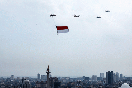 IDXChannel - Sejumlah pesawat tempur F-16 TNI AU dan Helikopter gabungan milik TNI-Polri terbang melintas di atas Monas saat Upacara Peringatan Detik-Detik Proklamasi di kawasan Jakarta Pusat, Rabu (17/8/2022).