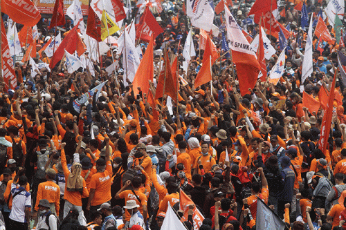 IDXChannel - Buruh melakukan aksi unjuk rasa di depan gedung DPR, Jakarta, Sabtu (14/5/2022).