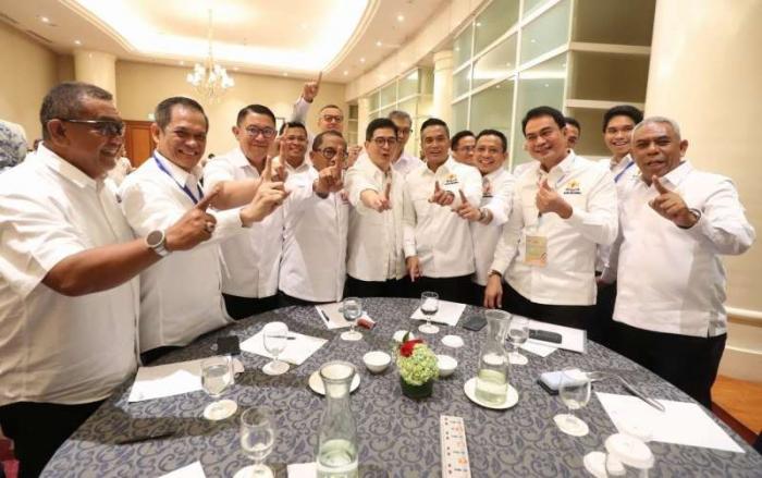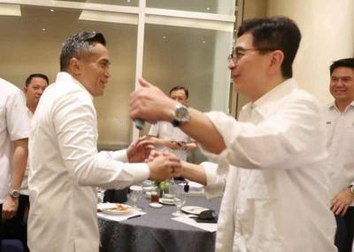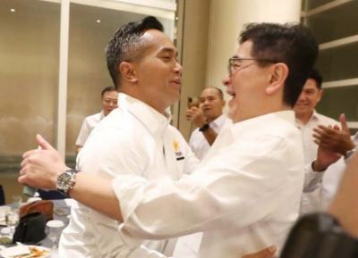 IDXChannel - Ketua Umum Kamar Dagang dan Industri (Kadin) Indonesia Anindya Bakrie berjabat tangan dan berpelukan dengan Ketua Dewan Pertimbangan Kadin Indonesia Arsjad Rasjid di sela Musyawarah Nasional Konsolidasi Persatuan Kadin Indonesia, Jakarta, Kamis (16/1/2025).