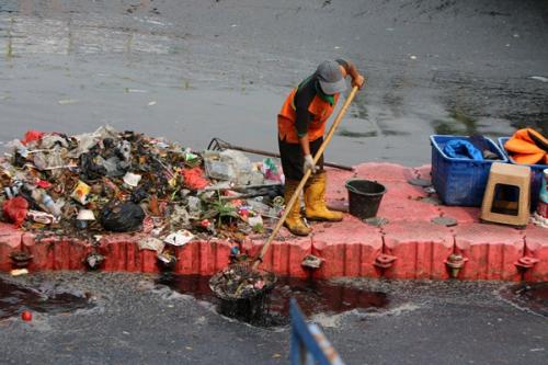 Petugas mulai membersihkan sampah saat musim hujan tiba untuk mengantisipasi penyumbatan yang dapat menyebabkan banjir.