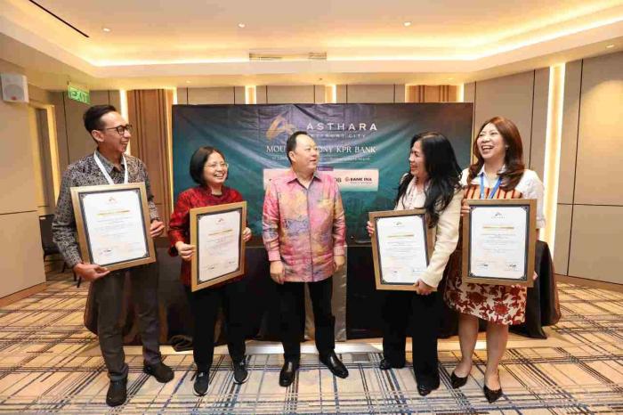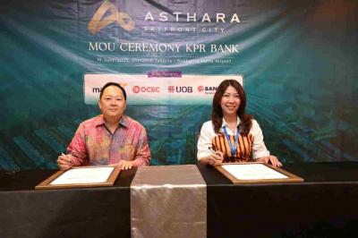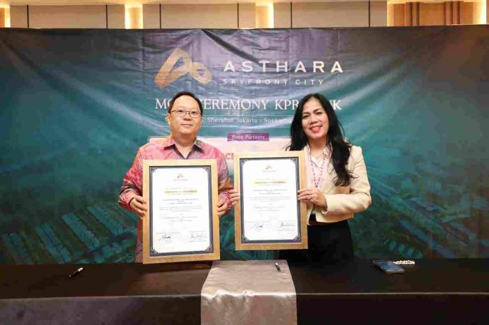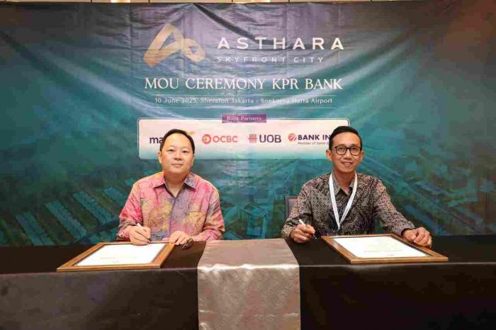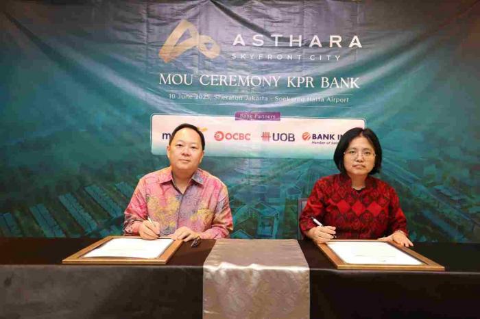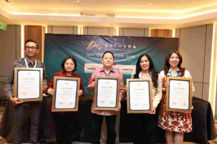 IDXChannel - (Kiri-kanan) Kepala Regional Housing and Secured Loan Bank UOB Erwin Roniyoes Tanjung, Personal Lending Business Head Bank OCBC Merry, CEO Asthara Skyfront City Supardi Ang, Vice Presiden Bank Mandiri Area Tangerang Kisamaun Agnes Silalahi, dan Kepala Divisi Consumer Loan Bank INA Idartaryati berfoto bersama usai menandatangani kerja sama pembiyaan di Kota Tangerang, Banten, Selasa (10/6/2025).