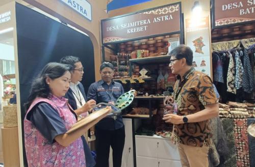IDXChannel - (Kiri - kanan) Sekretaris Pengurus Yayasan Astra - Yayasan Dharma Bhakti Astra, Ema Poedjiwati, Head of CSR Management Department PT Astra International Tbk, Triyanto, Wakil Ketua Pengelola Desa Sejahtera Astra Krebet, Riyadi Jibril dan Ketua Pengurus Yayasan Astra - Yayasan Dharma Bhakti Astra, Rahmat Samulo melihat kerajinan tangan pada pameran INACFRAFT 2026 di Jakarta, Jumat (6/2/2026).