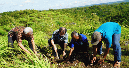 IDXChannel - Ketua Pengurus Yayasan Dharma Bhakti Astra (YDBA), Sigit P. Kumala (kedua kiri), Advisor YDBA, Tonny Sumartono (kiri) bersama para petani serai wangi menanam serai wangi sebagai rangkaian acara peresmian program pembinaan petani serai wangi di Desa Dlingo, Bantul, Yogyakarta, Rabu (21/12/2022).