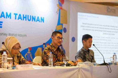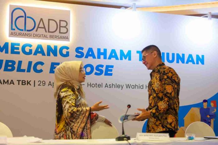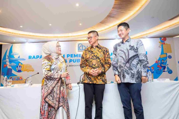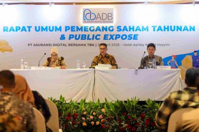 IDXChannel - Direktur Utama Adi Wibowo Adisaputro (tengah) didampingi Direktur Kepatuhan Sofi Suryasnia dan Direktur Keuangan Randy Tandra hadir pada paparan publik PT Asuransi Digital Bersama Tbk (YOII) di Jakarta, Selasa (29/4/2025).