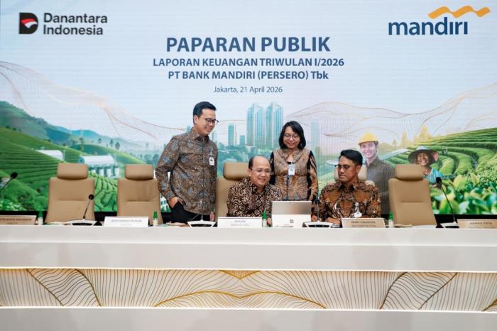 Bank Mandiri secara konsolidasi berhasil mencatatkan kinerja yang solid dengan membukukan laba bersih secara konsolidasi sebesar Rp15,4 triliun atau tumbuh 16,6% secara YoY hingga kuartal I 2026. Hal ini ditopang oleh penyaluran kredit bank only juga tumbuh 17,4% YoY menjadi Rp1.530 triliun serta dukungan pertumbuhan Dana Pihak Ketiga (DPK) bank only sebesar 21,1 % YoY pada Maret 2026.