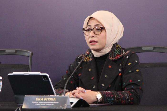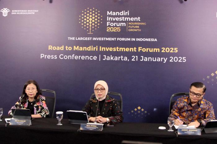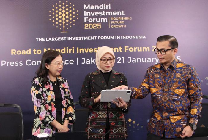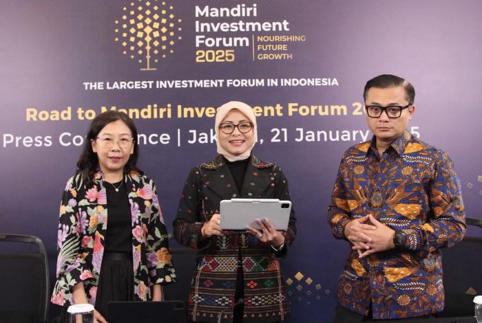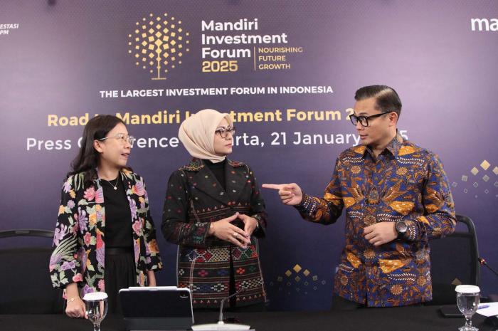 IDXChannel - Chief Economist Bank Mandiri Andry Asmoro (kanan), Direktur Treasury dan International Banking Bank Mandiri Eka Fitria (tengah), dan Direktur Capital Market Mandiri Sekuritas Silva Halim (kiri) memberikan keterangan pers terkait Pre-Event MIF 2025 di Jakarta, Selasa (21/1/2025).