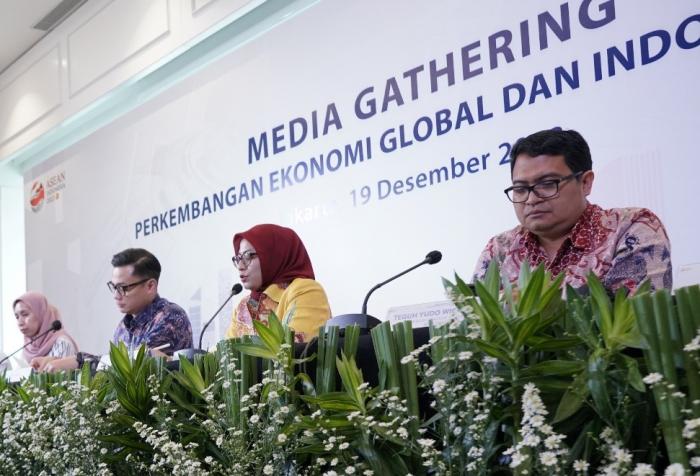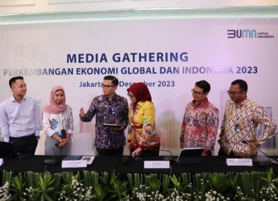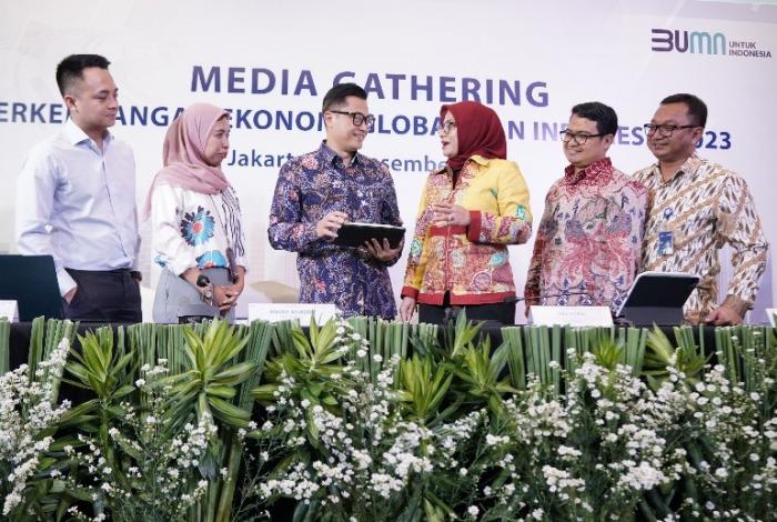 IDXChannel - (Kiri - kanan) Head of Equity Research, Strategy, Consumer Mandiri Sekuritas Adrian Joezer, Head of Macroeconomic Outlook and Financial Market Research Bank Mandiri Dian Ayu Yustina, Chief Economist Bank Mandiri Andry Asmoro, Direktur Treasury and International Banking Bank Mandiri Eka Fitria, Head of Strategic Research Bank Mandiri Teguh Yudo Wicaksono, dan Head of Industry and Regional Research Bank Mandiri Dendi Ramdani hadir pada acara Media Gathering Perkembangan Ekonomi Global dan Indonesia 2023 di Jakarta, Selasa (19/12/2023).