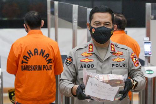 IDXChannel - Kadiv Humas Polri Irjen Pol Argo Yuwono (tengah) didampingi Karo Penmas Brigjen Pol Rusdi Hartono (kanan) dan Direktur Tindak Pidana Korupsi Bareskrim Polri Brigjen Pol Djoko Poerwanto (kiri) menunjukan barang bukti saat jumpa pers OTT Bupati Nganjuk di Bareskrim Polri, Jakarta, Selasa (11/5/2021).