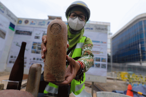 IDXChannel - Pekerja menunjukkan artefak pada lokasi proyek MRT CP203 Bundaran HI-Kota di kawasan Glodok, Jakarta Barat, Selasa (20/9/2022).