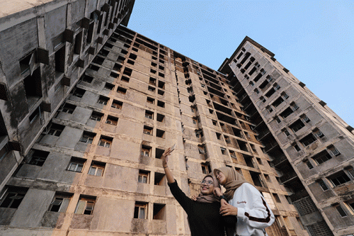 IDXChannel - Pengunjung melakukan swafoto dengan latar belakang bangunan rusun yang menjadi lokasi syuting film Pengabdi Setan 2: Communion di Kawasan Bekasi, Jawa Barat, Rabu (10/8/2022).