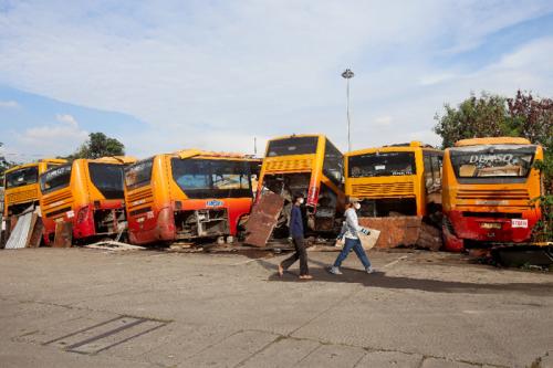 IDXChannel - Pejalan kaki melintas di dekat rongsokan bus Transjakarta di Terminal Pulogadung, Jakarta Timur, Minggu (27/6/2021).