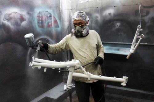 Pekerja sedang melakukan pengecatan frame sepeda di salah satu bengkel khusus cat sepeda kawasan Jakarta Selatan, akhir pekan lalu. Di masa pandemi Covid-19, permintaan pengecatan ulang (repaint) sepeda meningkat tajam.