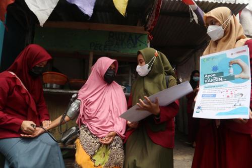 IDXChannel - Mahasiswa Fakultas Ilmu Kesehatan (FIK) Universitas Muhammadiyah Surabaya (UM Surabaya) memeriksa kesehatan warga ketika melakukan program jemput warga musiman untuk vaksin di perkampungan sekitar kampus UMSurabaya, Jawa Timur, Selasa (14/9/2021).