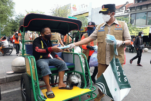 "Melanjutkan kegiatan yang sudah dilakukan minggu-minggu sebelumnya, BNPB membagikan masker di beberapa daerah yang mengalami peningkatan kasus Covid, DKI Jakarta, kemudian Jawa Barat dan kemarin di Jawa Tengah, sekarang beralih ke Yogyakarta," ucap Suharyanto saat membagikan masker di kawasan Malioboro, Kota Yogyakarta, Provinsi Yogyakarta.