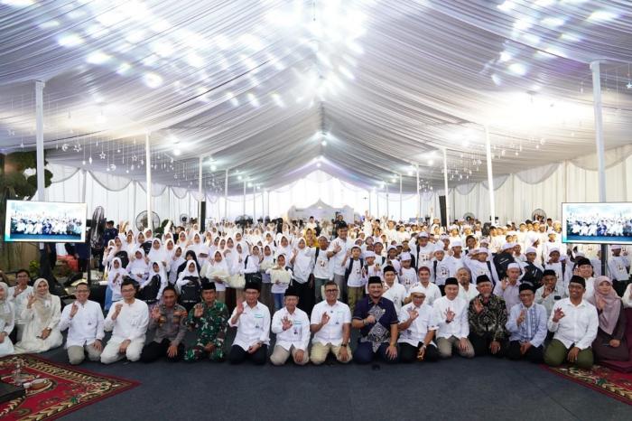 IDXChannel - Direktur Utama PT Bank Syariah Indonesia (Persero) Tbk (BSI) Anggoro Eko Cahyo (empat dari kiri), bersama Komisaris Utama BSI Muhadjir Effendy (tiga dari kiri), Ketua Dewan Pengawas Syariah BSI Prof KH Hasanudin (paling kiri), Direktur Information Technology BSI Muharto Hadi Suprapto (lima dari kiri) dan Bupati Aceh Tamiang Armia Fahmi (dua dari kiri) berfoto bersama anak anak dalam acara Santunan 5000 Anak Yatim dan Wakaf Al-Quran yang berpusat di Aceh Tamiang, Minggu (8/3/2026).