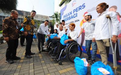 IDXChannel - Direktur Utama Bank BTN Nixon LP Napitupulu bersama Corporate Secretary BTN Ramon Armando membagikan paket sembako secara simbolis kepada kaum disabilitas serta warga sekitar Menara BTN, di Jakarta, Selasa (2/4/2024).