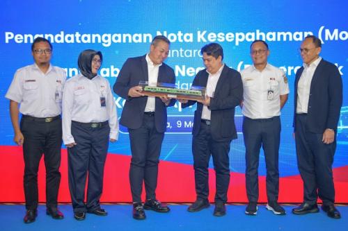 IDXChannel - Direktur Network & Retail Funding PT Bank Tabungan Negara (Persero) Tbk (BTN) Rully Setiawan (tengah) bersama Direktur Utama PT Kereta Api Pariwisata (KAI Wisata) Raden Agus Dwinanto Budiadji (kedua dari kanan) menandatangani Nota Kesepahaman (MoU) kerja sama strategis disaksikan Managing Director of Commercial and Business PT Kereta Api Indonesia (Persero) Rafli Yandra (kanan) di Stasiun Gambir, Jakarta, Senin (9/3/2026).