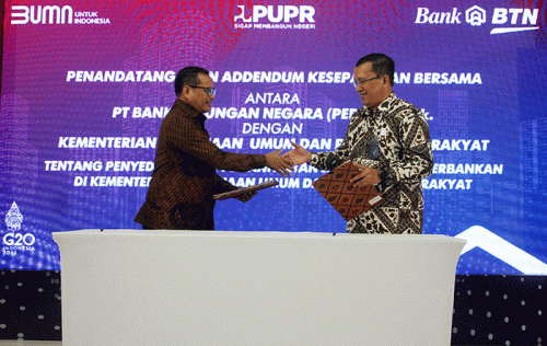 IDXChannel - Direktur Distribution and Funding Bank BTN Jasmin (kedua kanan) bersama Kepala Biro Kepegawaian, Organisasi, dan Tata Laksana, Sekretariat Jenderal Kementerian Pekerjaan Umum dan Perumahan Rakyat (PUPR) Canka AS Putri (kedua kiri) disaksikan Direktur Utama Bank BTN Haru Koesmahargyo (kanan) serta Sekretaris Jenderal Kementerian PUPR, Mohammad Zainal Fatah menandatangani Perjanjian Kerja sama (PKS) tentang Penyediaan Jasa Layanan Perbankan kepada Pegawai Kementerian PUPR di Jakarta.