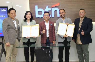 IDXChannel - Direktur Risk Management PT Bank Tabungan Negara (Persero) Tbk, Setiyo Wibowo (kedu dari kiri) dan SEVP Digital Business Thomas Wahyudi (kiri) serta Direktur Keuangan PT Mandiri Capital Indonesia (MCI) Wisnu Setiadi menyaksikan penandatanganan perjanjian kerja sama partisipasi yang dilakukan oleh Kepala Divisi Transformation & Partnership Management Division BTN, Erika dan Direktur Utama MCI Ronald Simorangkir di Jakarta, Rabu (8/1/2025).