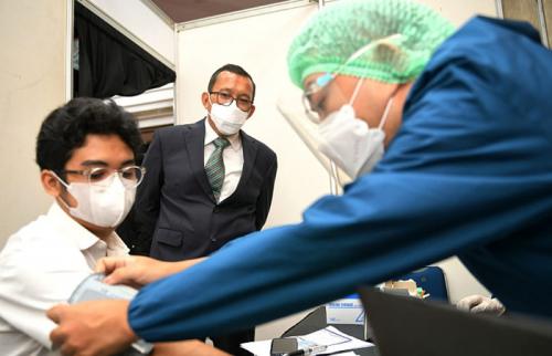 IDXChannel - Direktur Utama PT Bank Tabungan Negara (Persero) Tbk Haru Koesmahargyo (kanan) didampingi Human Capital Division Head Bank BTN Abdul Firman dan Corporate Secretary Bank BTN Ari Kurniaman meninjau pelaksanaan Vaksinasi Gotong-Royong bagi pegawai dan keluarga pegawai se-Jabotabek di Kantor Pusat Bank BTN, Jakarta, Senin (7/6/2021).