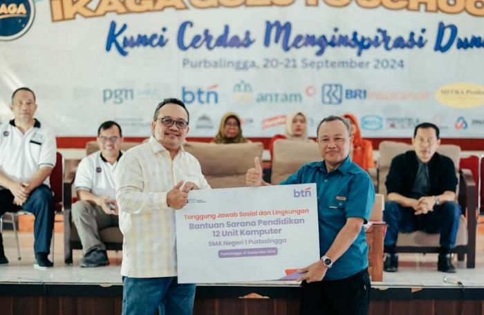 IDXChannel - Direktur Information Technology BTN Andi Nirwoto menyerahkan secara simbolis bantuan sarana pendidikan kepada Kepala SMAN 1 Purbalingga, Joko Mulyanto saat acara Talkshow IKAGA di Purbalingga, Jawa Tengah, akhir pekan lalu.