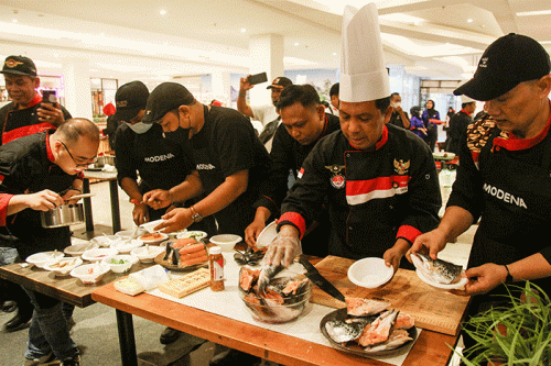 Para juru masak (chef) ini dengan sigap mengolah bahan baku kepala ikan salmon dan sosis untuk diolah dengan berbagai bahan bumbu jadi menu masakan yang bercita rasa kedaerahan. Dewan Pimpinan Daerah ICA Sumsel bertekad memajukan kuliner dari pelosok Sumsel ke tingkat nasional dan internasional.