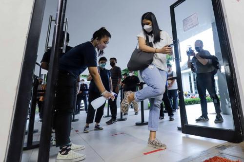 IDXChannel - Penonton duduk dengan menjaga jarak dalam kegiatan simulasi kehadiran penonton untuk pertandingan Indonesia Basketball League (IBL) Tokopedia 2022 di Hall Basket Senayan, Jakarta Pusat, Jumat (7/1/2022).